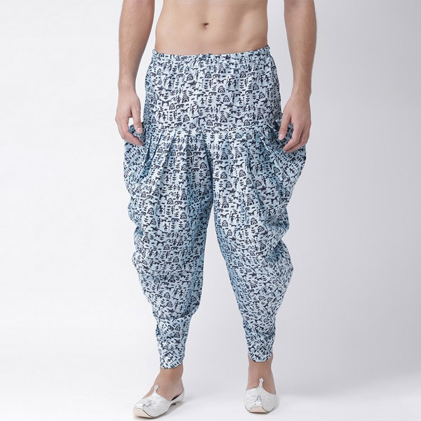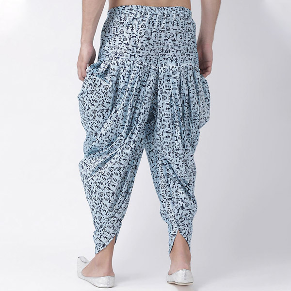 - Blue printed mid-rise dhoti with gathered and pleated detail, has an elasticated waistband