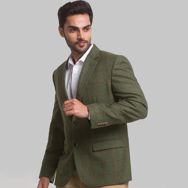 Green checked regular-fit blazer, has a notched lapel, long sleeves, single-breasted with a double button closure, three pockets, an attached lining and a double-vented back hem.