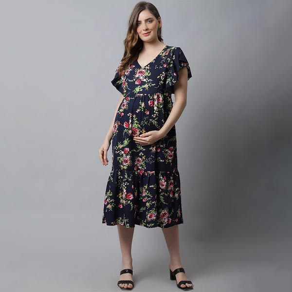 Women Navy Blue Floral Crepe Maternity A-Line Midi Dress